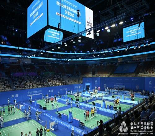 10月20日,十五运会群众比赛羽毛球项目决赛在深圳市体育中心体育馆开赛。来自26支代表队的515名运动员本周将在深圳展开角逐,总计将产生10枚金牌。