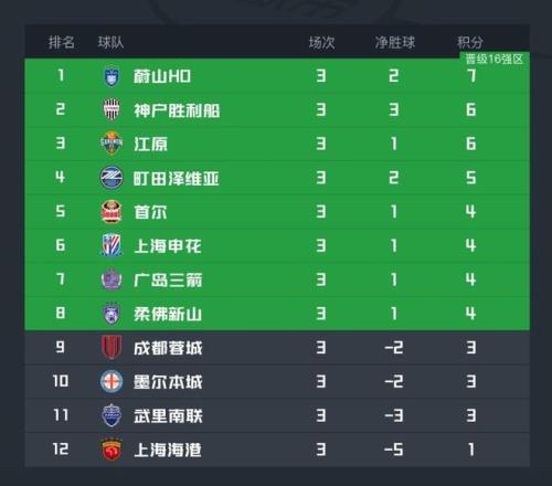 亚冠精英实时积分榜:申花升至第6跻身晋级区,成都第9,海港垫底