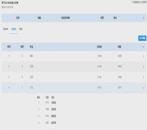 今晚(11月20日),十五运会进行了田径项目男子4×100米接力决赛。由苏炳添、刘洪熙、施君豪、陈冠锋组成的广东队以38秒71,最终名列第四,遗憾未能站上领奖台。