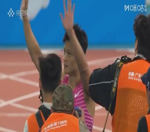 苏炳添表示:“能够坚持到今天,在我的家乡跟大家说一句再见,我感到非常荣幸。今天看整个体育场都是高朋满座的,谢谢你们的到来!”