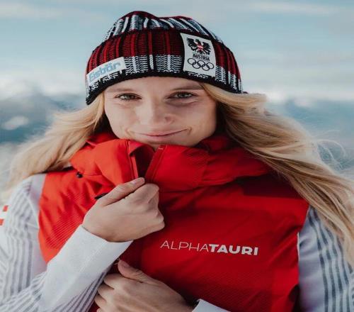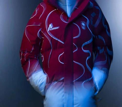 奥地利队本届的冬奥服装,由奥地利红牛集团在2016年创立的时尚品牌AlphaTauri提供,设计灵感源自阿尔卑斯山脉的壮丽景色,采用流畅的廓形和醒目的图案印花来展现白雪皑皑的山峰上光影交错的风景。