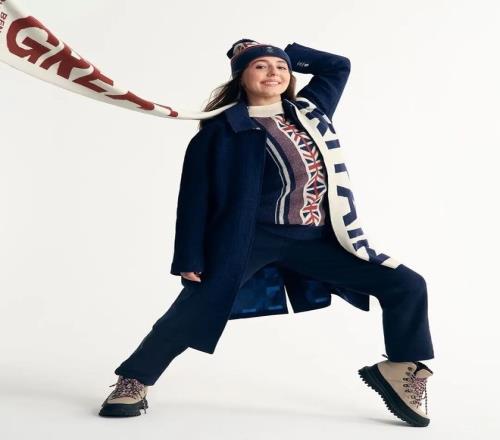 开幕式造型是一件羊毛犬牙纹大衣,内搭一件羊毛混纺高领毛衣,毛衣上饰有凸起的条纹和英国国旗图案,下身是饰有同色系英国国旗织带的运动裤,整体搭配着超大围巾和红白蓝三色鞋带的冬靴。闭幕式上,造型转变为宽松版型,运动员将身穿厚实的羊毛混纺针织运动外套,内搭一件海军蓝和米白色高领打底衫。