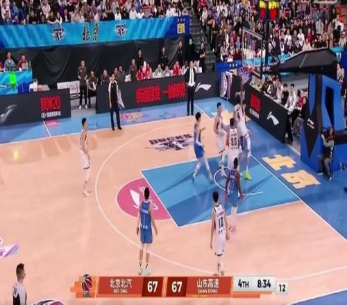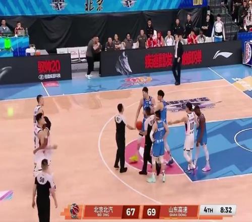 第四节赛场突发火药味!比赛还剩下8分钟34秒,山东外援珀赛尔杀入北京队禁区,一跃而起双脚腾空隔扣了周琦,