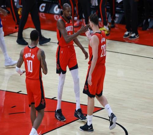 进攻端,火箭还是非常依赖杜兰特,昨天不敌雷霆的比赛中,杜兰特打了37分钟,本场比赛,杜兰特打了40分钟,最直观的表现是第四节终结阶段,没有杜兰特在场期间,火箭的进攻开发一团糟,杜兰特仅仅休息了两个回合,乌度卡立马将杜兰特换回场上,可见杜兰特的重要性,以及火箭目前在进攻端暴露出巨大的问题,杜兰特是乌度卡解决进攻问题的最大砝码,但是这样的出场时间,以及频频立棍单打,对于37岁的老将实在太累了,消耗太大了。