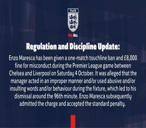 英足总今日官方宣布,切尔西主帅马雷斯卡因此前对阵利物浦比赛时的不当行为,被处罚停赛一场+罚款8000英镑。 在英超第7轮对阵利物浦的比赛中,切尔西在最后时刻读秒绝杀,随后马
