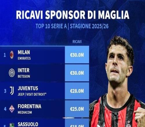 意甲俱乐部球衣胸前广告赞助费TOP10:米兰双雄3000万并列第1